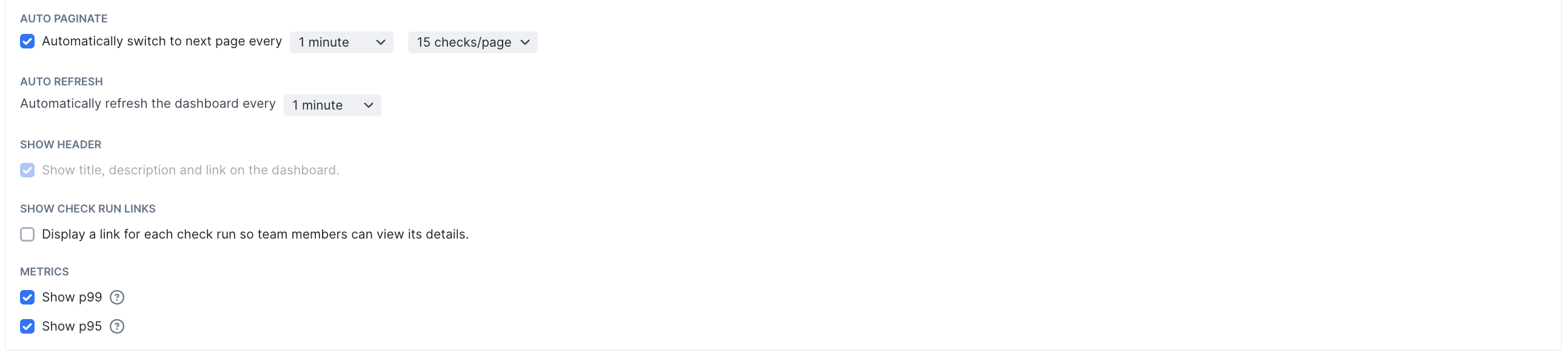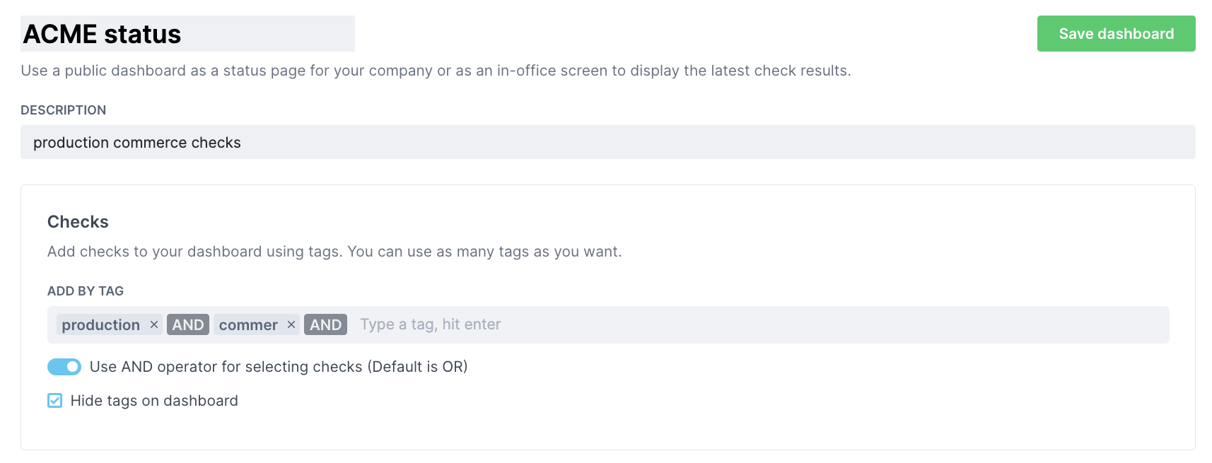 - checks: Specify the tags of the checks you want to show on the dashboard. By default we show all checks. You can also choose to hide the tags from the dashboard.